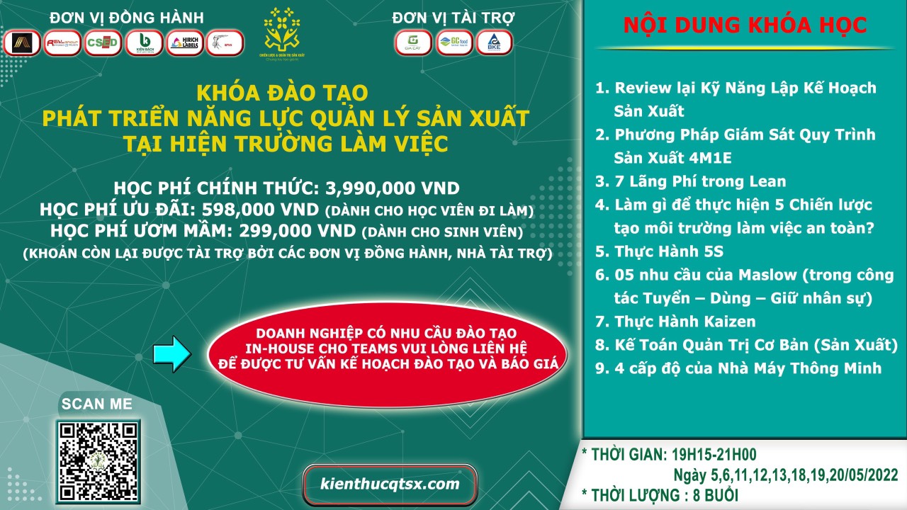- Đối Tượng Tham Gia : Cán bộ/Công Nhân Viên có nhu cầu trao dồi/ phát triển Kiến Thức liên quan đến Quản Lý Sản Xuất :